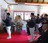 必勝祈願の神事を行う成章高野球部員と関係者(田原市、崋山神社で)