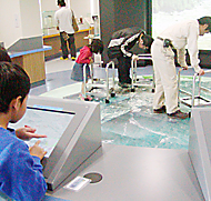 航空写真を大きなレンズでのぞいたり、自宅地震シミュレーションで耐震診断をする市民