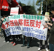2学部の名古屋笹島地区への移転が計画されている愛知大学(堀彰三学長)の豊橋校舎で、11日、これに反対する学生たちがデモ行進を行った。 同大は、今年初めに行われた「名古屋市ささしまライブ24地区開発提案競技」で最優秀提案者に決定。名古屋市笹...