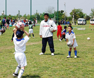 子どもたちは、ドリブル、シュート、1対1での攻防、ミニゲームなど基礎技術の習得やバランス感覚、敏しょう性を向上させるプログラムを消化。チーム指導者も練習法を学んだ。コーチは、子どもたちに対し「ナイスシュート」「今の感覚を忘れないで」などとプレーひとつずつをほめ、やる気を引き出していた。