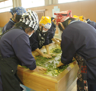 ホイロの上で茶葉をもむ生徒たち(石巻中学校で)