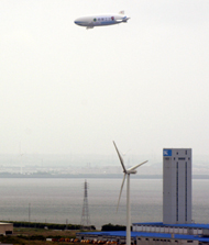 飛行船ツェッペリンNT号が、東三河に飛来、29日午後には大垣―関ケ原経由で滋賀県に向かった。この飛行船を豊川市の嶋勝康さんが、御津山頂から撮影した。 ゆったりと風力発電の風車が回る三河湾上空を旋回し、三河港豊橋ふ頭近くの係留地に停泊。同飛...