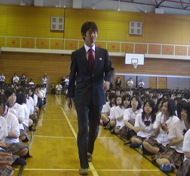 後輩に健闘を誓う岩水選手(豊川高校で)