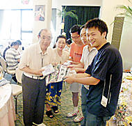 留学生3人が可知夫妻㊧にお礼のプレゼント