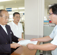 住民投票条例制定の請求手続きを行う伊藤会長(左)と伊奈氏