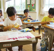 真剣な表情でなしの皮をむく児童たち(小沢小学校で)