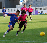 SCH×名古屋グランパス三好(西三河)の決勝戦は、SCHの選手が、スピード感たっぷりにピッチをかけ回り、次々とグランパスゴールにシュート。6―1と圧勝。観客席をわかせた。