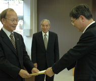 西村副知事が加藤町長(左)に回答書を手渡す