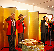 乾杯する大澤会長(左端)ら(オーエスジーグローバルテクノロジーセンターで)