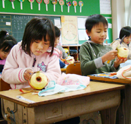 真剣な表情でりんごの皮をむく児童たち(富士見小学校で)