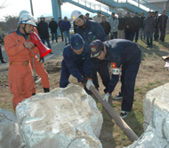 コンクリート片をてこの原理で持ち上げる消防団員ら