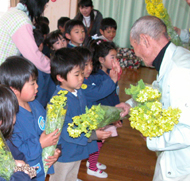 菜の花の花束をプレゼントされる園児(東郷西保育園)