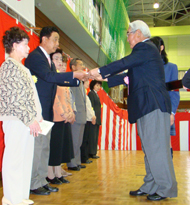 水野会長から感謝の盾を受け取る代表者(豊橋市総合体育館で)