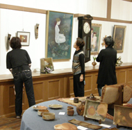 見事な日本画と陶芸作品が並ぶ会場(大野宿美術珈琲鳳来館で)