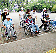 車いすで段差の乗り降りを体験(桜ヶ丘公園で)