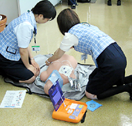 AEDの取り扱いを体験する職員(蒲郡信用金庫本店で)