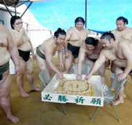 土俵の形にした500個のいなり寿司を次々にほおばる力士たち