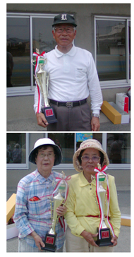 男子Aゾーン優勝の大根茂さん㊤女子Aゾーン優勝の花井さん㊨とBゾーン優勝の金子さん