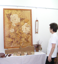 力作の木工作品が展示されている萬木(豊橋市東光町で)