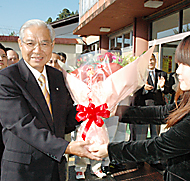 女子職員から花束を贈られる横山町長