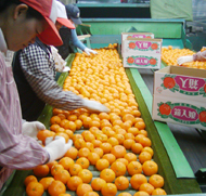 初出荷のため選果する箱入娘(総合集出荷場で)