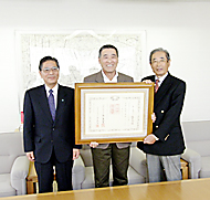 飯田副市長㊧と紺綬褒章伝達を受けた大澤会長㊥と市川会長㊨
