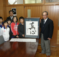 「真心」の書と権田さん㊨と児童ら