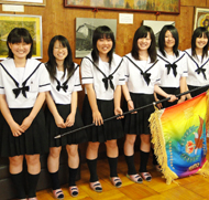 笑顔で優勝旗を持つ情報処理部員たち(新城高校で)