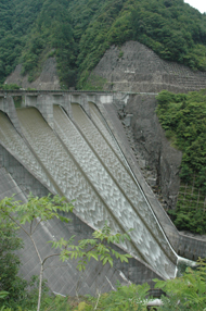 オーバーフロー水が美しい縞模様を描く大島ダム