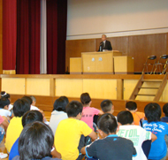 夏休み中の注意事項などを語りかける小山校長(老津小学校で)