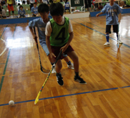 スティックを使ってボールをコントロール(豊川市御津体育館で)