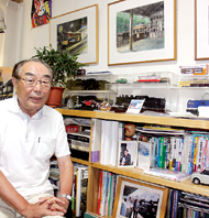 路面電車の絵、模型、資料に囲まれた伊奈会長の自宅アトリエ