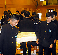 模擬紙幣でお金の重さを味わう中学生(豊橋市五並中学校で)