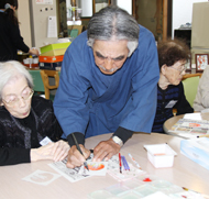 長田さんに手伝ってもらいながらの絵手紙作り(JAひまわり稲荷北デイサービスセンターで)
