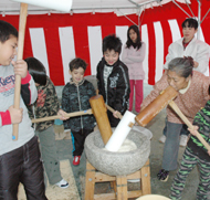 餅つきに挑戦する子どもたち(県営岩田住宅で)