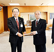 山脇市長に意見書を手渡す福田会長(左から2人目)=豊川市役所で