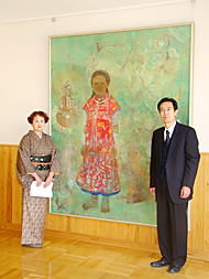 寄贈した絵画「スーリヤの娘」と高木さん㊧、曽根校長(吉田方中学校で)