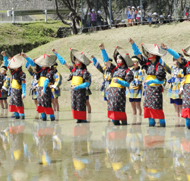 かわいい早乙女姿の小学生たち(東郷東小近くの田んぼで)