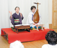 語り部の田中ふみえさん㊧と薩摩琵琶の村田青水さん㊨