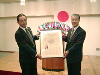 クラブ認証状を^高橋新会長に手渡す政木会長(右)