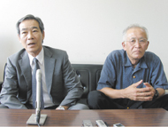 市長選への出馬を表明する稲葉氏㊧、右は同席する金原市長