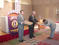 1年間のアルバムを贈られる鈴木会長(左)と鈴木達夫幹事(中)