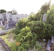 墓石が隠れるほど雑草が生い茂った墓所もある(飯村墓地で)