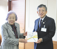 寄付をする高畑郁子さん㊧(豊橋市役所で)