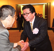 支持者と握手を交わす杉田氏(ホテル日航豊橋で)