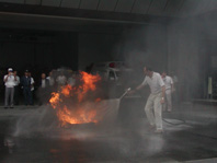 消火実演するクロバック社長