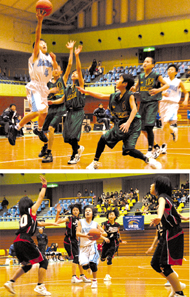 (上)正確なシュートを見せた佐々木選手㊧ 、(下)主将としてチームを優勝に導いた長坂選手㊥=豊橋市総合体育館で