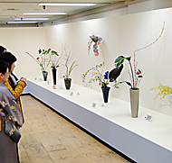 多様な表現のいけばなが並ぶ(名豊ビルで)