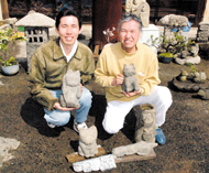 作品を手にする鈴木登三信さん㊨と力弥さん㊧親子(田原・石彫工房で)