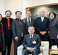 豊橋市ふるさと大使で画家、松井守男さんが6日、同級生らとともに、豊橋市役所を訪れ、佐原光一市長に近況を報告した。 最新作「大和魂」3部作を完成させたばかり。3月下旬に、3日間をかけて吉永小百合さんをモデルに久賀島のアトリエで描き、男性モデ...